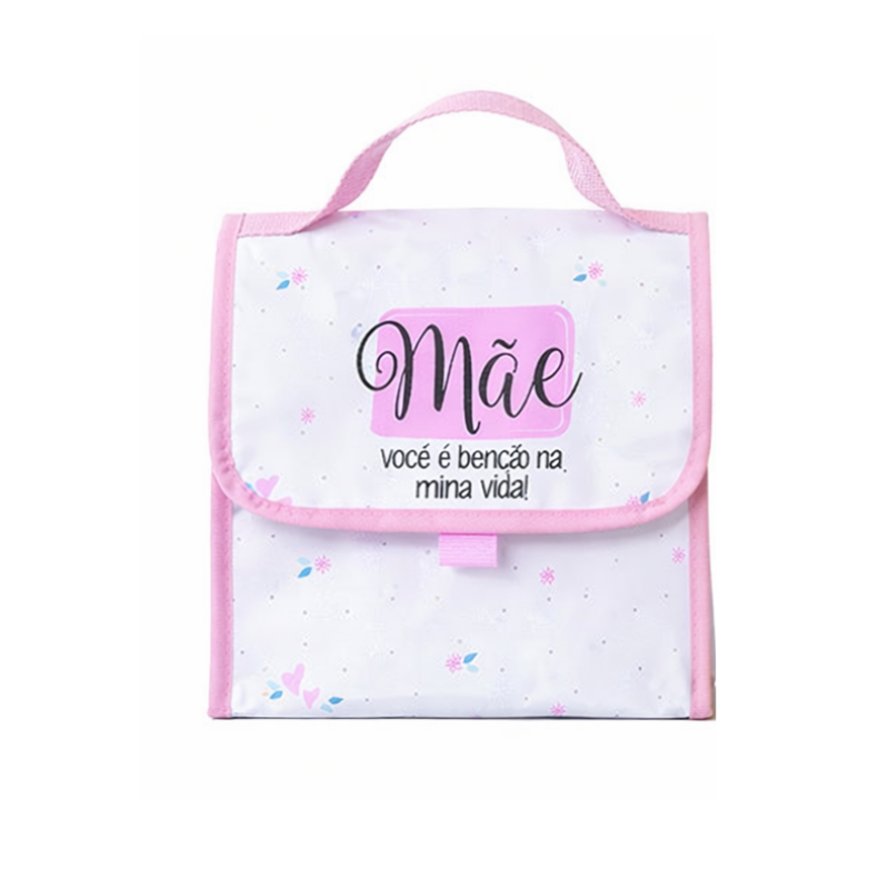 A bolsa térmica com tema de dia das mães conta com interior em alumínio e fechamento frontal, tornando fácil o manuseio no dia a dia. Material de alta qualidade.